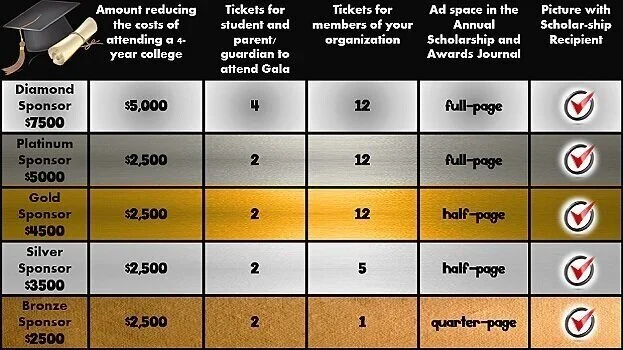 With your help and generosity, we would like to provide our scholarship recipients with up to $2500 to reduce the impact of higher education costs. We ask for your support by reviewing and committing to one of the sponsorship packages below: